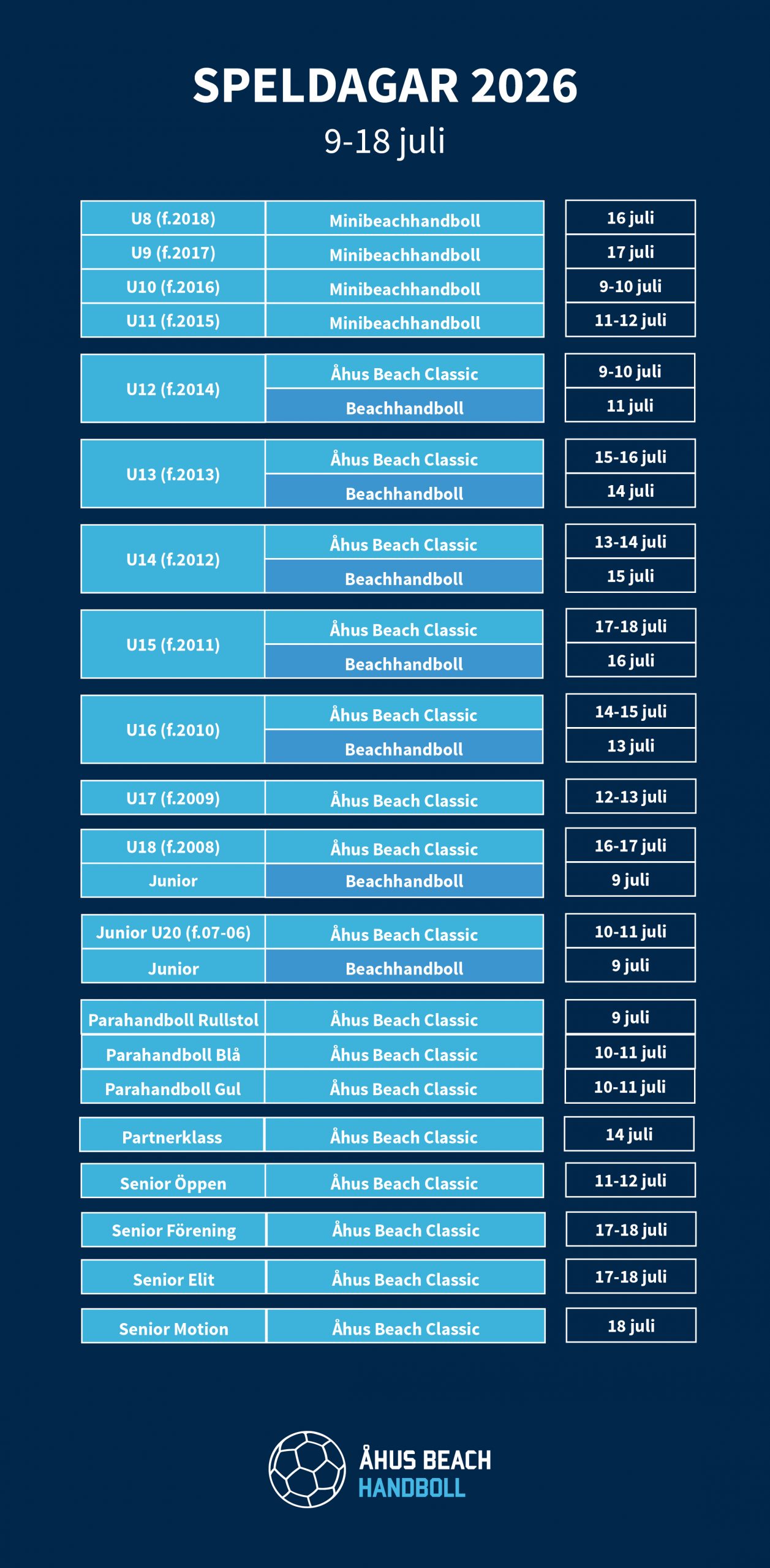 📅 Festivalen spelas 9-18 juli 2026 – tio dagar fyllda med sand, svett, handbollsglädje och sommarstämning vid stranden i Åhus. Som vanligt väntar en mix av matcher, musik, aktiviteter och möten med både gamla och nya beachvänner. Boka in sommaren 2026 redan nu!